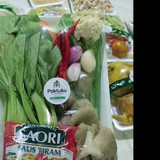 Satu paket berisi, saori saus tiram, bakso, pakcoy, daun bawang, bawang merah putih,cabe, pakcoy, kembang kol