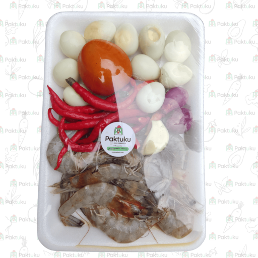 Satu pack udang,telur puyuh, bawang merah, bawang putih, cabe merah kriting, cabe rawit, pete (opsional jika sedang musim), kaldu ayam Porsi kami kini menyesuaikan harga pasar, tapi tenang, harga tetap sama dan kualitas tetap terjaga.
